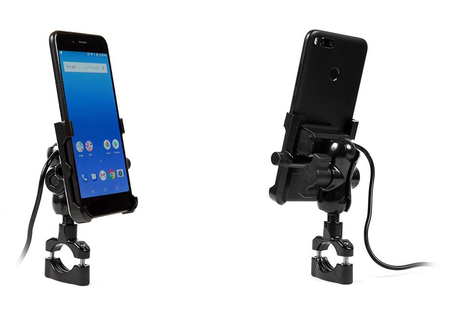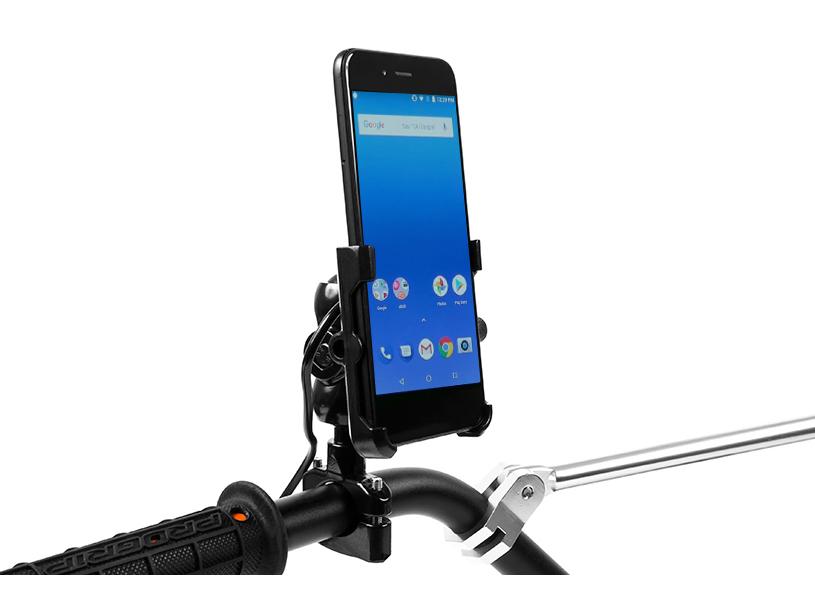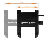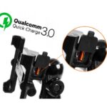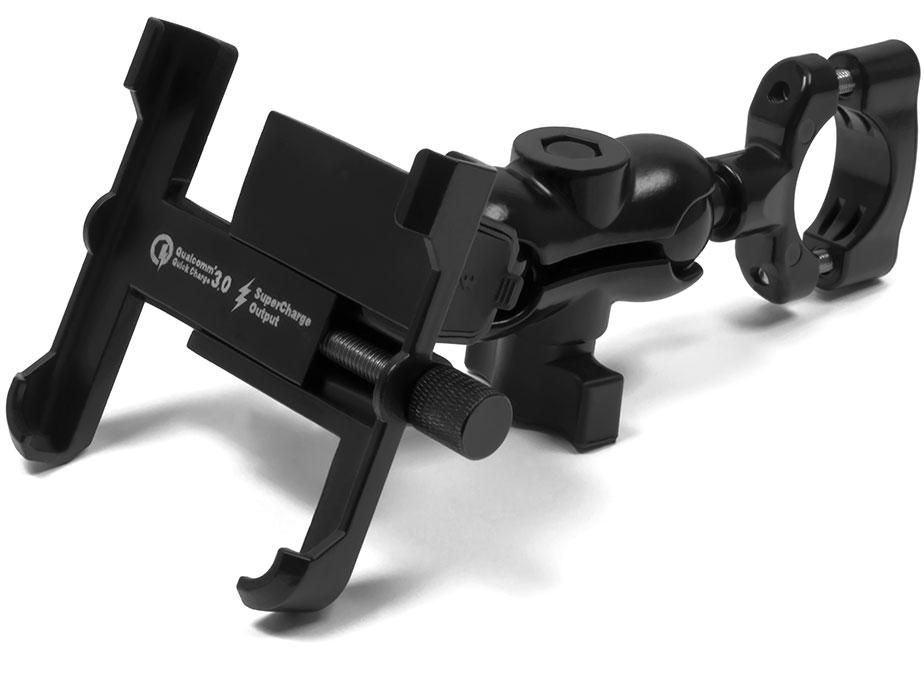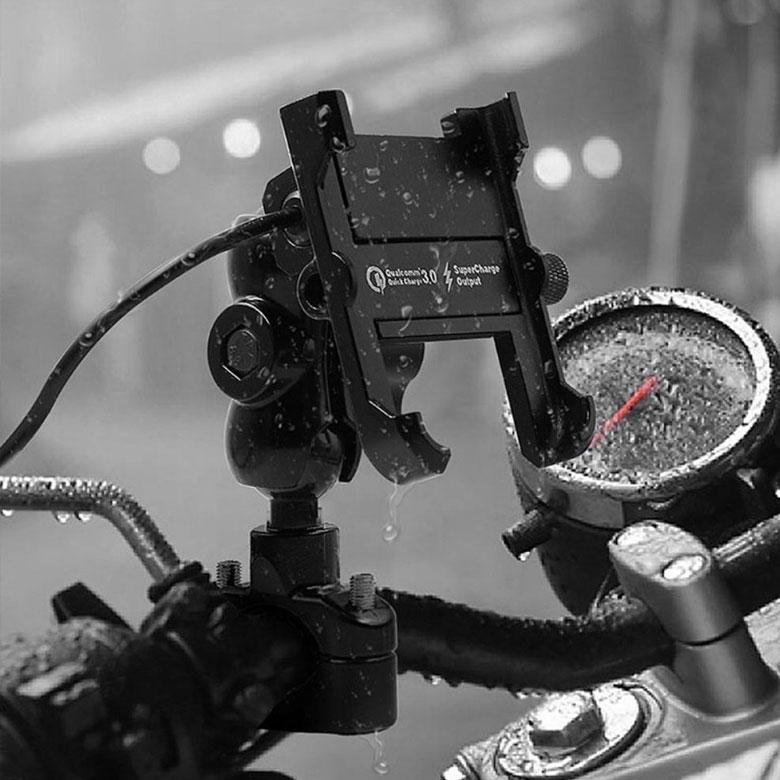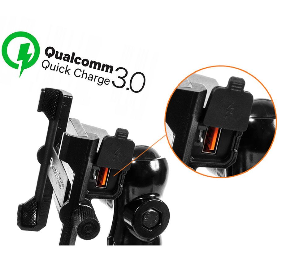 Metal motorcycle holder for mobile phone with USB QC 3.0 charger.