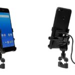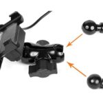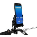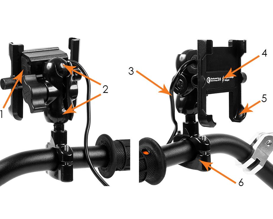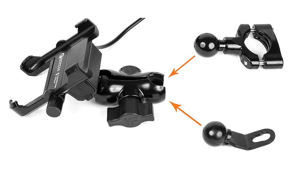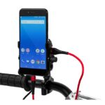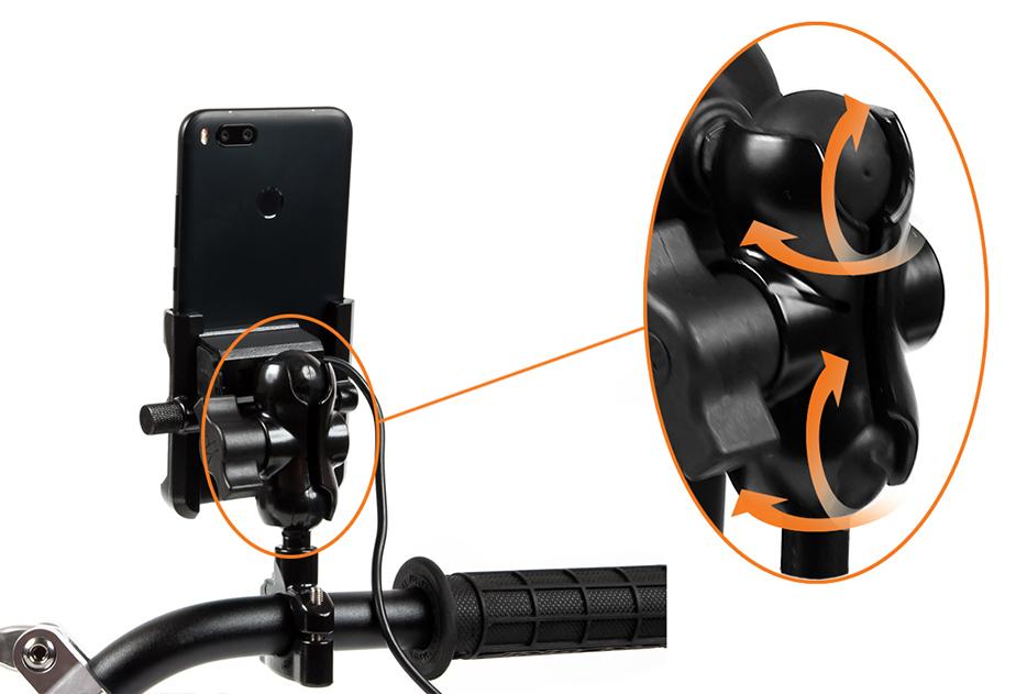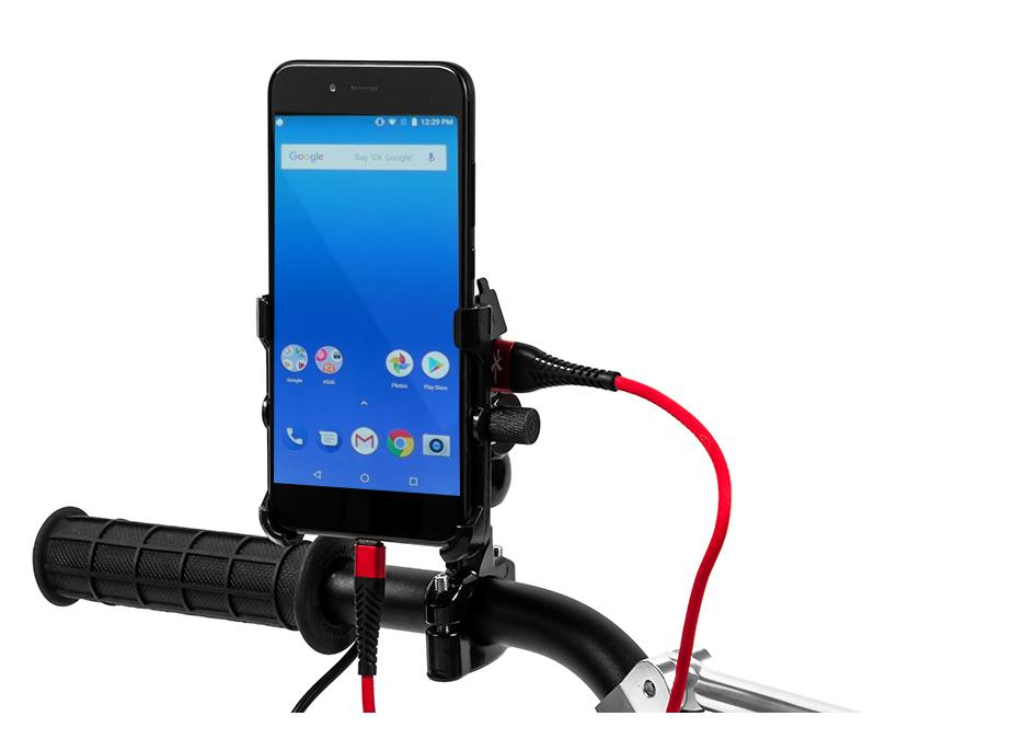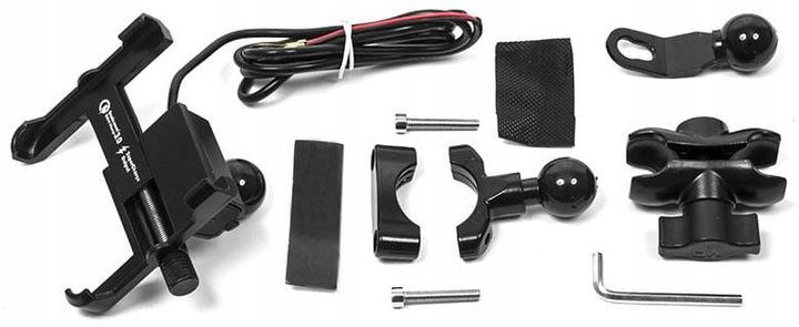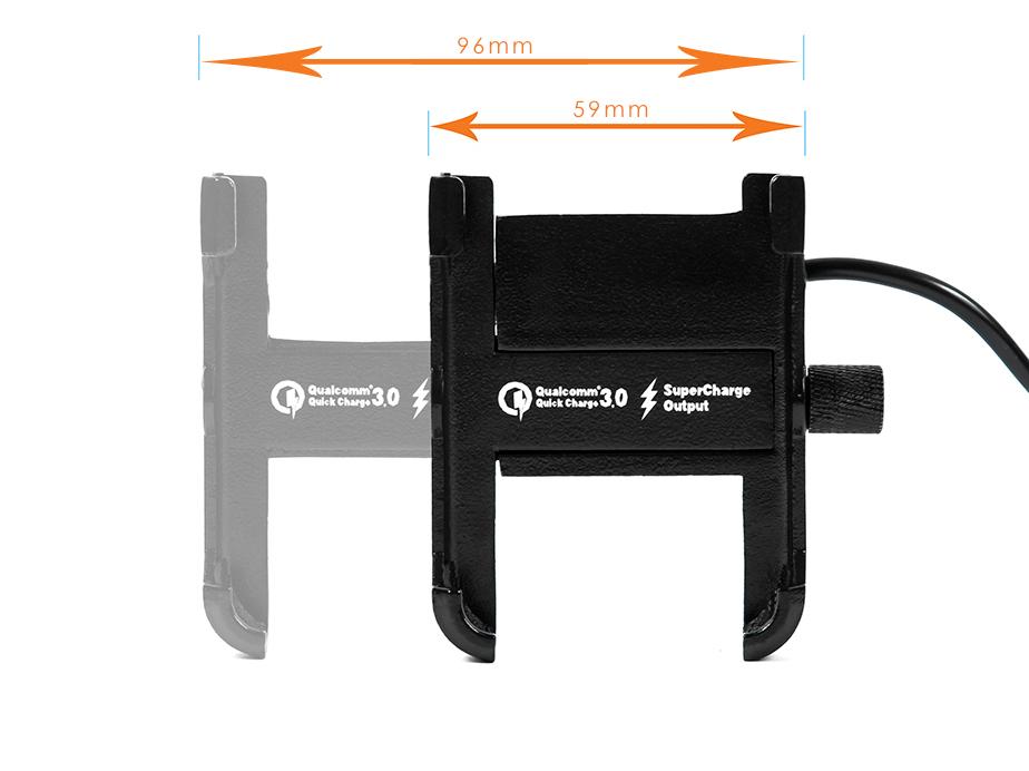 Metal motorcycle holder for mobile phone with USB QC 3.0 charger.