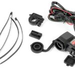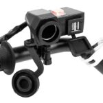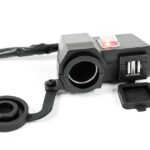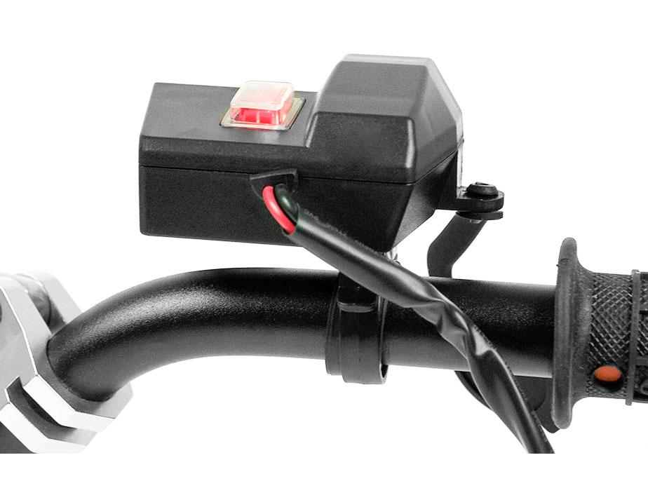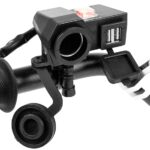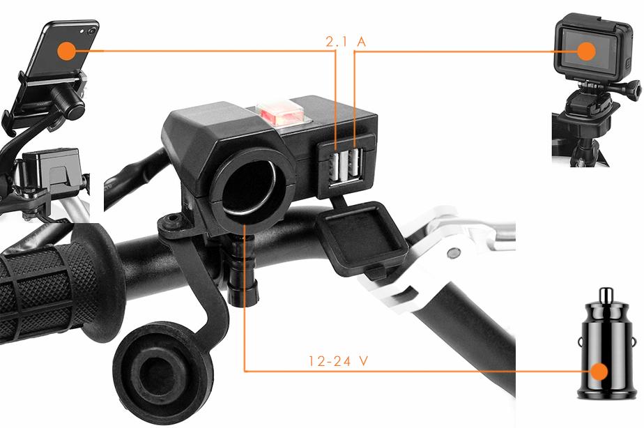 Motorcycle cigarette lighter socket with USB outputs mounted to the steering wheel. Universal output make the socket is compatible with virtually any device available on the market, eg. navigation, mobile phones and others.