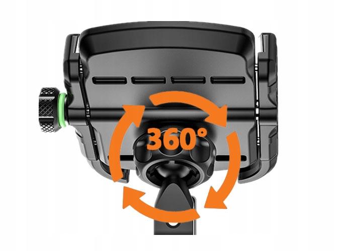 Konstrukcja uchwytu umożliwia ustawienie telefonu zarówno w poziomie jak i w pionie. Przegub kulowy umożliwia obracanie głowicy o 360° oraz zmianę kąta nachylenia względem ramienia. Dzięki temu możesz dostosować pozycję telefonu do swoich potrzeb.