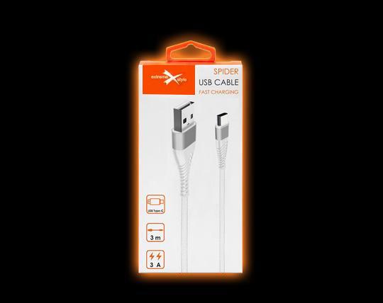 Kabel Spider do telefonów o długości 3 m łączy w sobie elegancki design, niezwykle wytrzymałe materiały oraz wysoce zaawansowany chipset, zapewniający kompatybilność ze wszystkimi urządzeniami elektronicznymi ze złączem USB Typ-C.